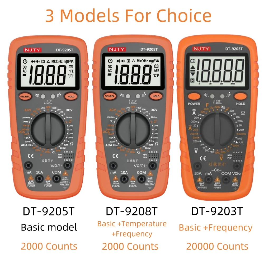 9205T and 9208T are digital multimeters with 3 1/2 2000 digits. 9203T with 20000 digitals. They are with goodappearance and overload protection circuit.The performance is reliable.It also has therubber jacket to protect the meter from drop.The unique design of magnetic adherencefunction can allow the users to free their hands during operation.