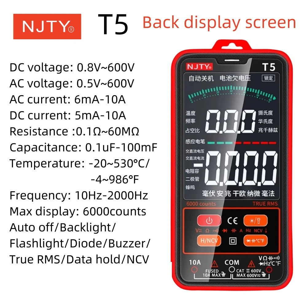 *T5 is a portable smart meter that can intelligently identify DC voltage,AC voltage,resistance,on-off buzzer,frequency,AC and DC current,etc.Automatically switch to thecorresponding range,or manually switch the diode,capacitance,temperature and othergears.Powerful functions are easy to use.Large-screen LCD display,6000 display makesthe reading more accurate.